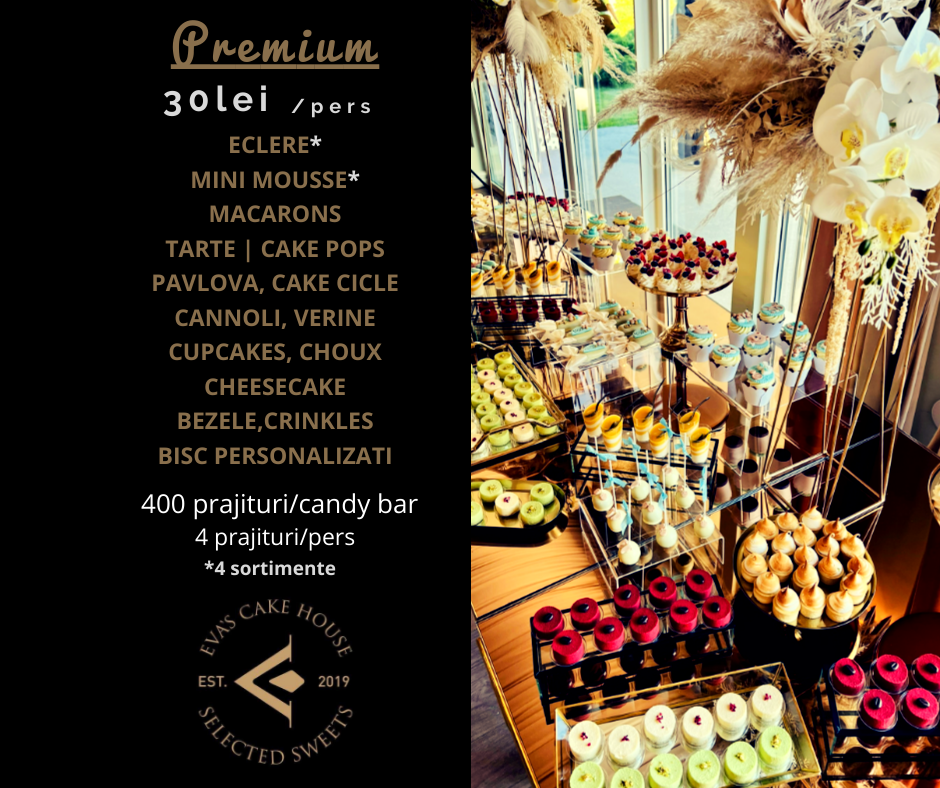 Toate produsele de candybar de la Eva Cake House sunt premium, realizate exclusiv cu ingrediente naturale, de calitate superioara si nu contin premixuri, lapte praf sau praf de ou fiind pregatite speciaI pentru evenimentuI contractat.